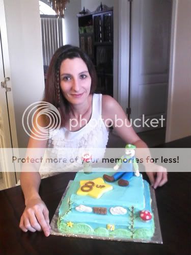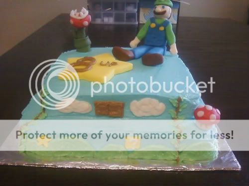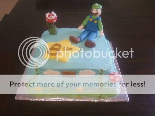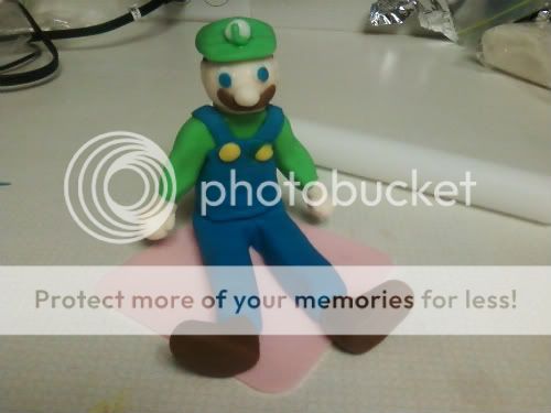 I stacked together an 8" chocolate square atop of a 10" chocolate square. Of course, mostly iced in butter cream, but I decided to use a little fondant with this one, just so I could have an excuse to play around with it again =) Surprisingly, to me, it turned out great! I was slightly disappointed in Luigi, as he was a little bigger than I planned him to be, as pictured below. But, I guess for my first time making such a figure like this, I did an awesome job, LOL!